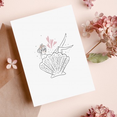 A playful silhouette emerges from a delicate seashell, like a modern, sparkling Venus. This illustration plays with softness and sensuality, capturing a joyful and liberated moment. Perfect for celebrating femininity, sending a knowing message, or simply making someone smile with tenderness.