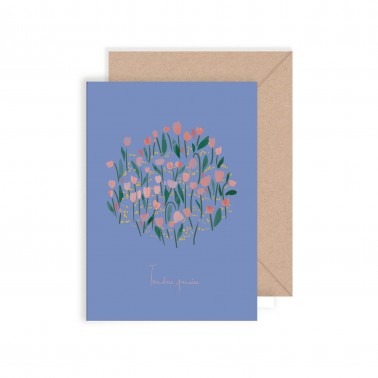 “Tender Thoughts” - A round bouquet of pink tulips and delicate flowers blooms against a soft blue background. This poetic card is perfect for sending a message of affection, comfort, or simply to remind someone that you are thinking of them fondly.