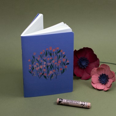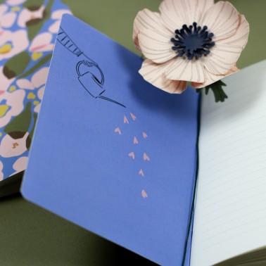 A round bouquet of pink tulips and delicate flowers blooms against a soft blue background. This illustrated notebook invites you to dream and relax, perfect for jotting down your thoughts, drawing, or simply capturing the precious little moments of everyday life. Inside, a small poetic illustration accompanies you. A delicate companion for cultivating the beauty of words.