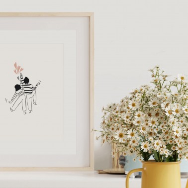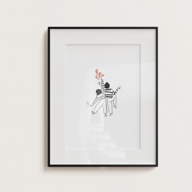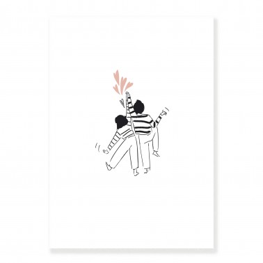 A loving couple launches into a joyful dance. This minimalist and tender illustration celebrates those little moments of shared joy, those moments when we let ourselves be carried away by lightheartedness and togetherness.