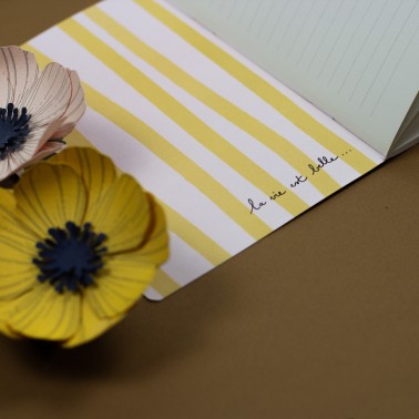 Un dahlia rose délicat porté comme un trésor. Ce carnet illustré célèbre la beauté des fleurs généreuses et l'élégance d'un instant suspendu, où une simple fleur suffit à illuminer la journée. À l'intérieur, une illustration "La vie est belle..." vous invite à croquer chaque moment avec douceur. Un carnet poétique pour capturer vos pensées et esquisses du quotidien.